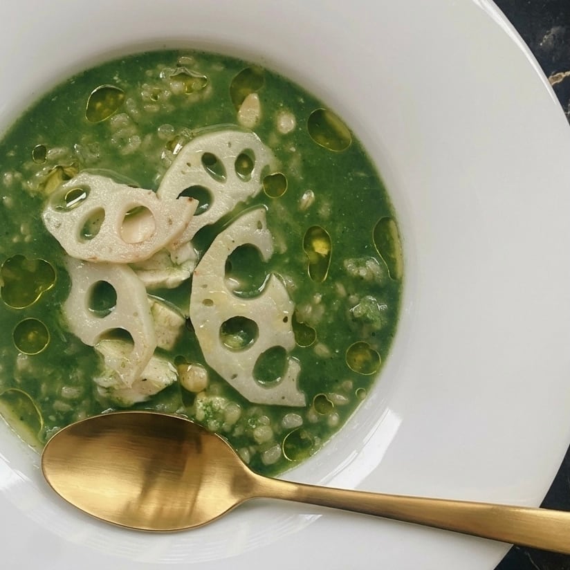 ふっくらした白身魚と、シャキッとした蓮根の食感が特徴。アクセントに松の実を入れ、ほうれん草をベースにした鮮やかなグリーンの豆乳ミルクのスープごはん。